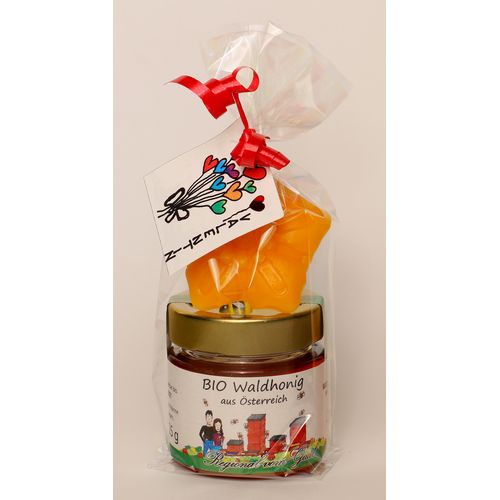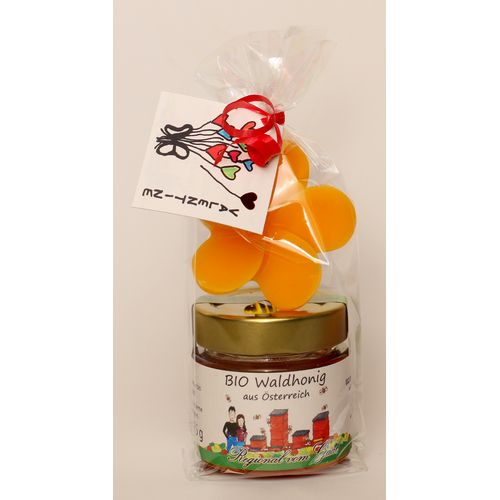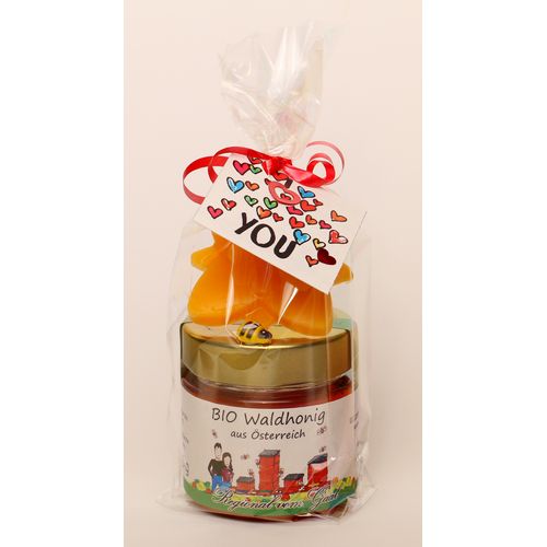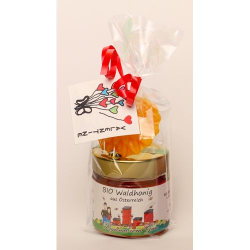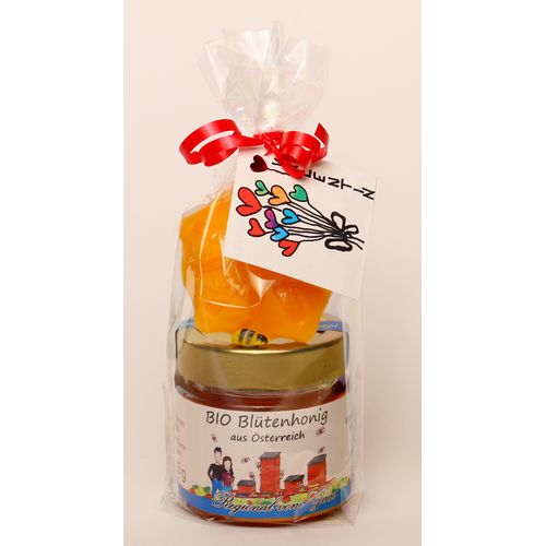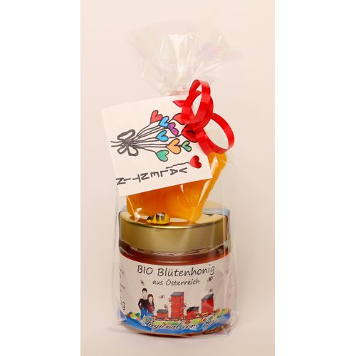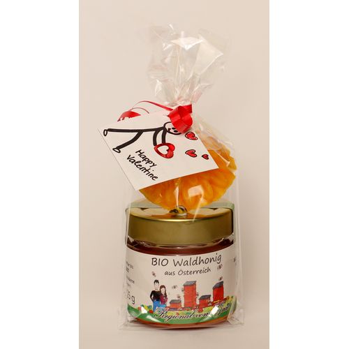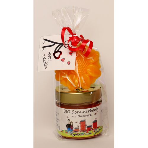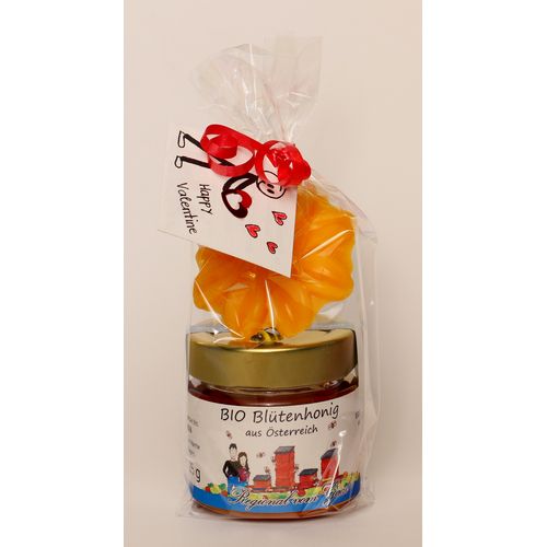 Liebevoll verpacktes Valentinstags-Geschenk bestehend aus einem Gläschen 125g Honig und einer Blume aus Bienenwachs.